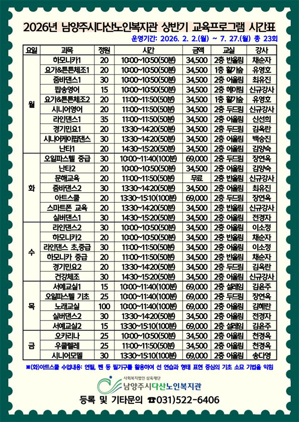 노년사회화교육 접수 및 시간표